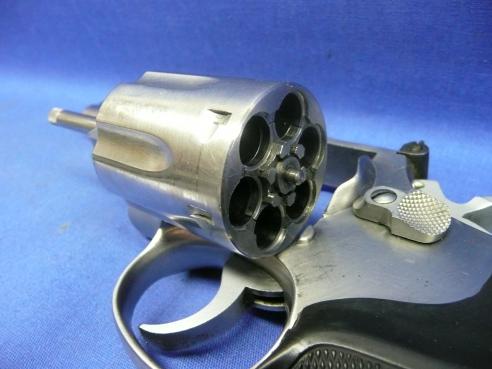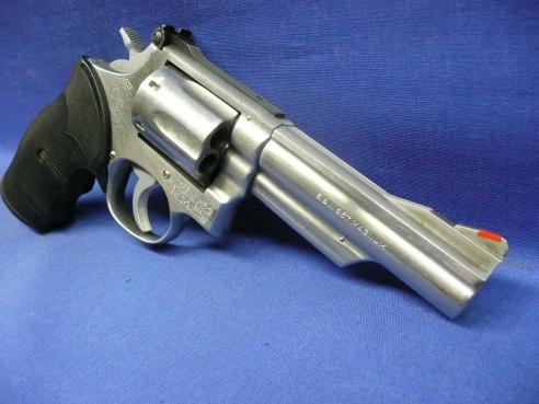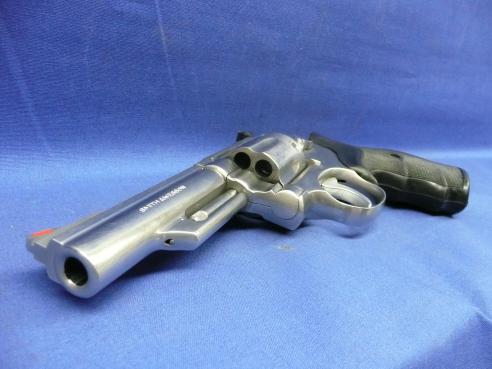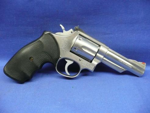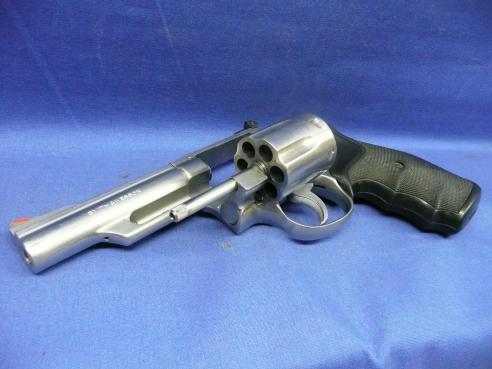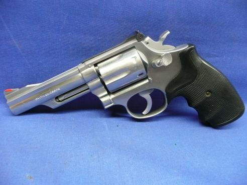 Classic S&W combat magnum revolver. Stainless finish 4" .357 Magnum revolver with 6-shot cylinder and recessed chambers. Timeless design that simply feels right in the hand. Small ding on the right side of the rear sight consistent with Law Enforcement use in a Right Hand Duty Belt holster. Overall in VG+ condition.